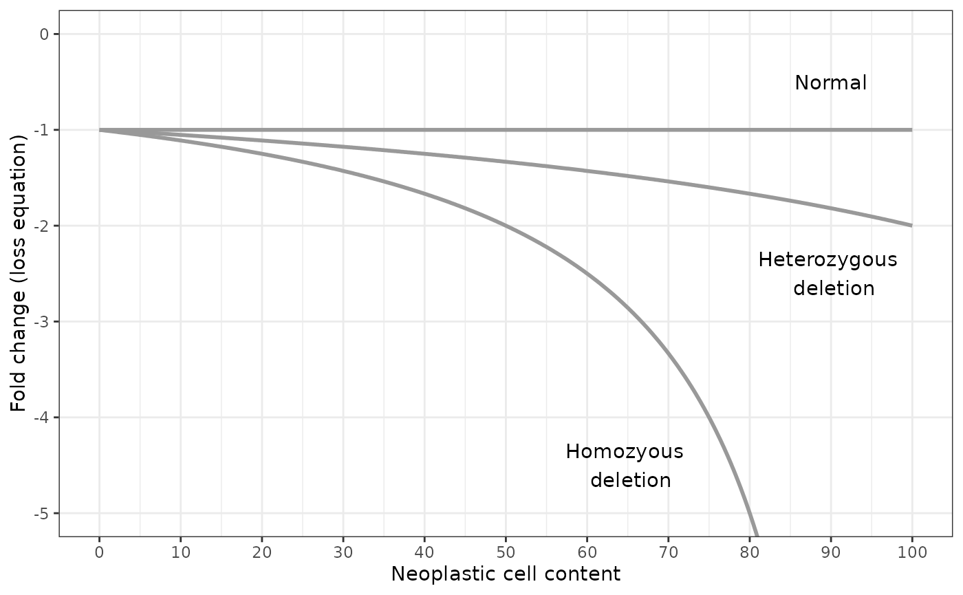 values_to = "fold_change")By plotting the results, we can see that determination of the neoplastic cell content is critical for differentiating between homozygous and heterozygous deletions when the fold change is greater than -2.